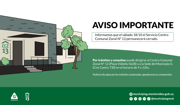 El Municipio G informa que el sábado 18 de octubre el servicio del Centro Comunal Zonal 13 permanecerá cerrado.