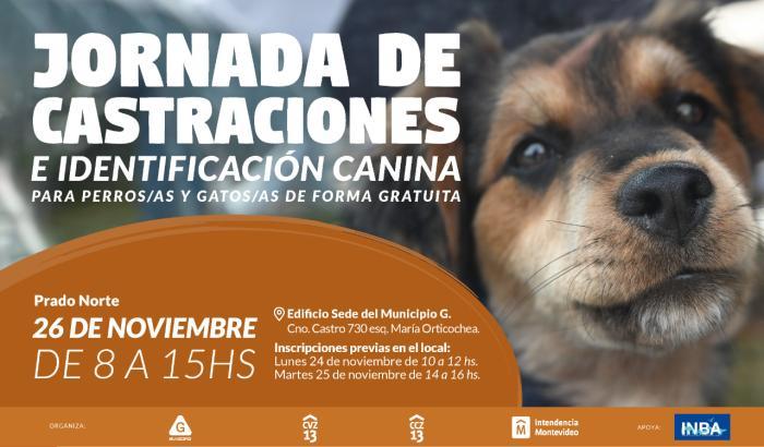 El próximo miércoles 26 de noviembre el Municipio G desarrollará una nueva jornada de castraciones gratuitas, que tendrá lugar en la sede central del tercer nivel de gobierno, sobre Cno. Castro 730 esquina María Orticochea. Se realizarán castraciones de perras/os y gatas/os, además de identificaciones caninas.