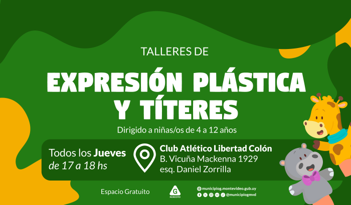 Todos los jueves, en el horario de 17:00 a 18:00 horas, se desarrolla el Taller de expresión plástica y títeres. Es una propuesta abierta y gratuita que tiene lugar en el Club Atlético Libertad Colón, ubicado sobre B. Vicuña Mackenna 1929.