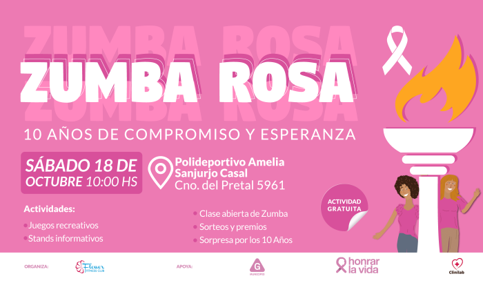 El próximo sábado 18 de octubre se llevará a cabo la actividad Zumba Rosa en el Polideportivo Amelia Sanjurjo Casal. Es una propuesta gratuita y abierta que se enmarca en el Día Mundial de Prevención del Cáncer de Mama, conmemorado cada 19 de octubre. La organización está a cargo de Flower Fitness Club y es apoyada por el Municipio G, Fundación Honrar la Vida y Clinilab.